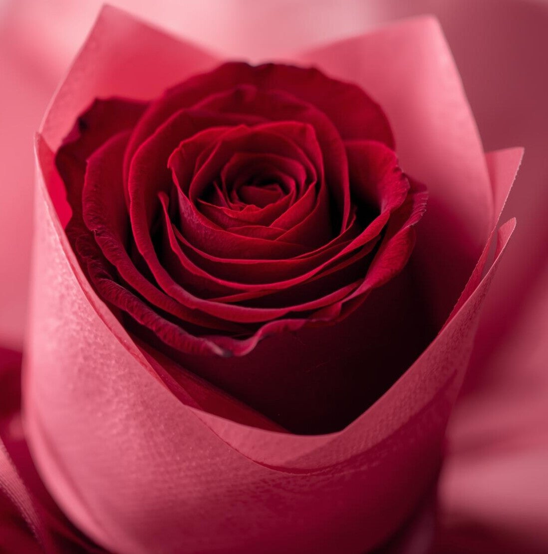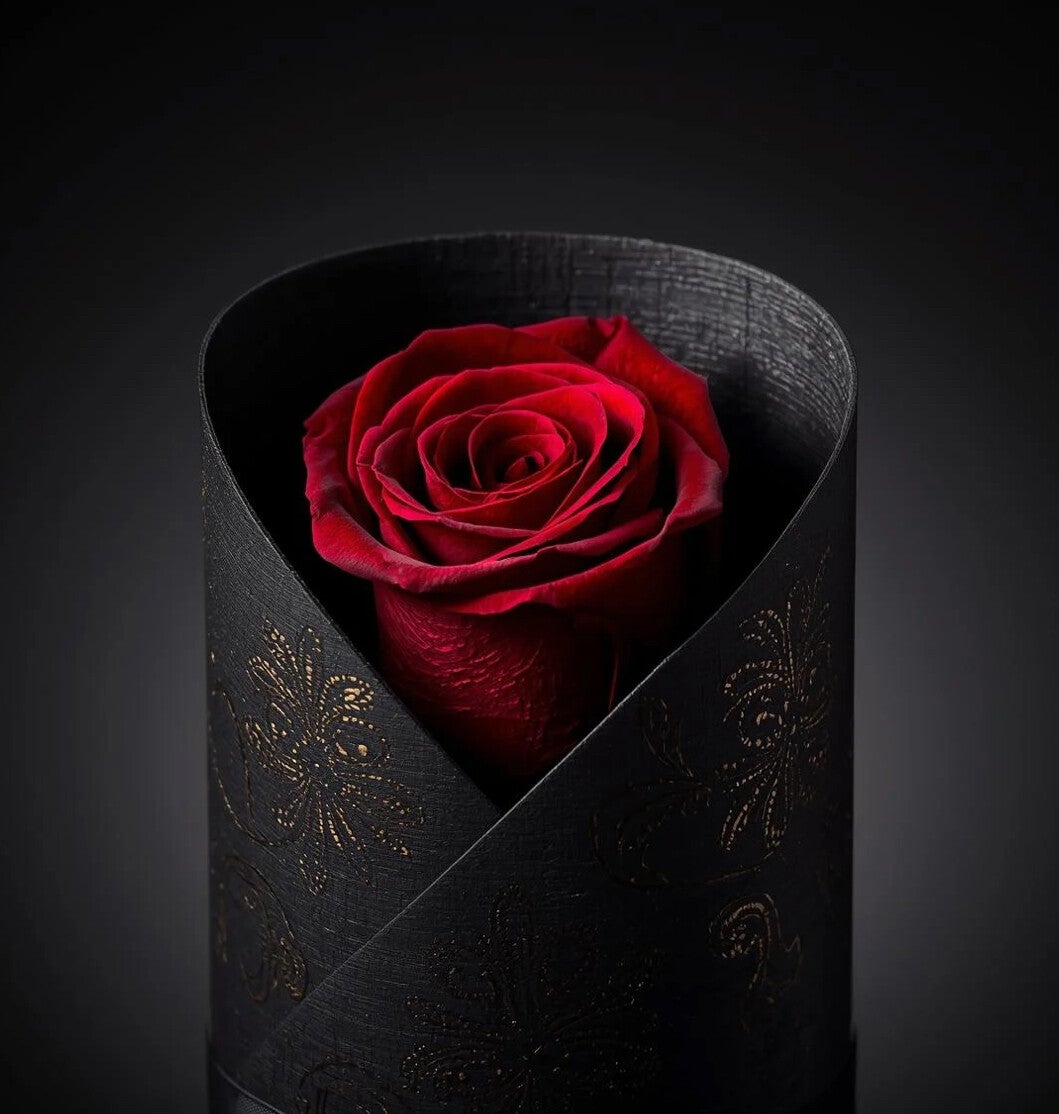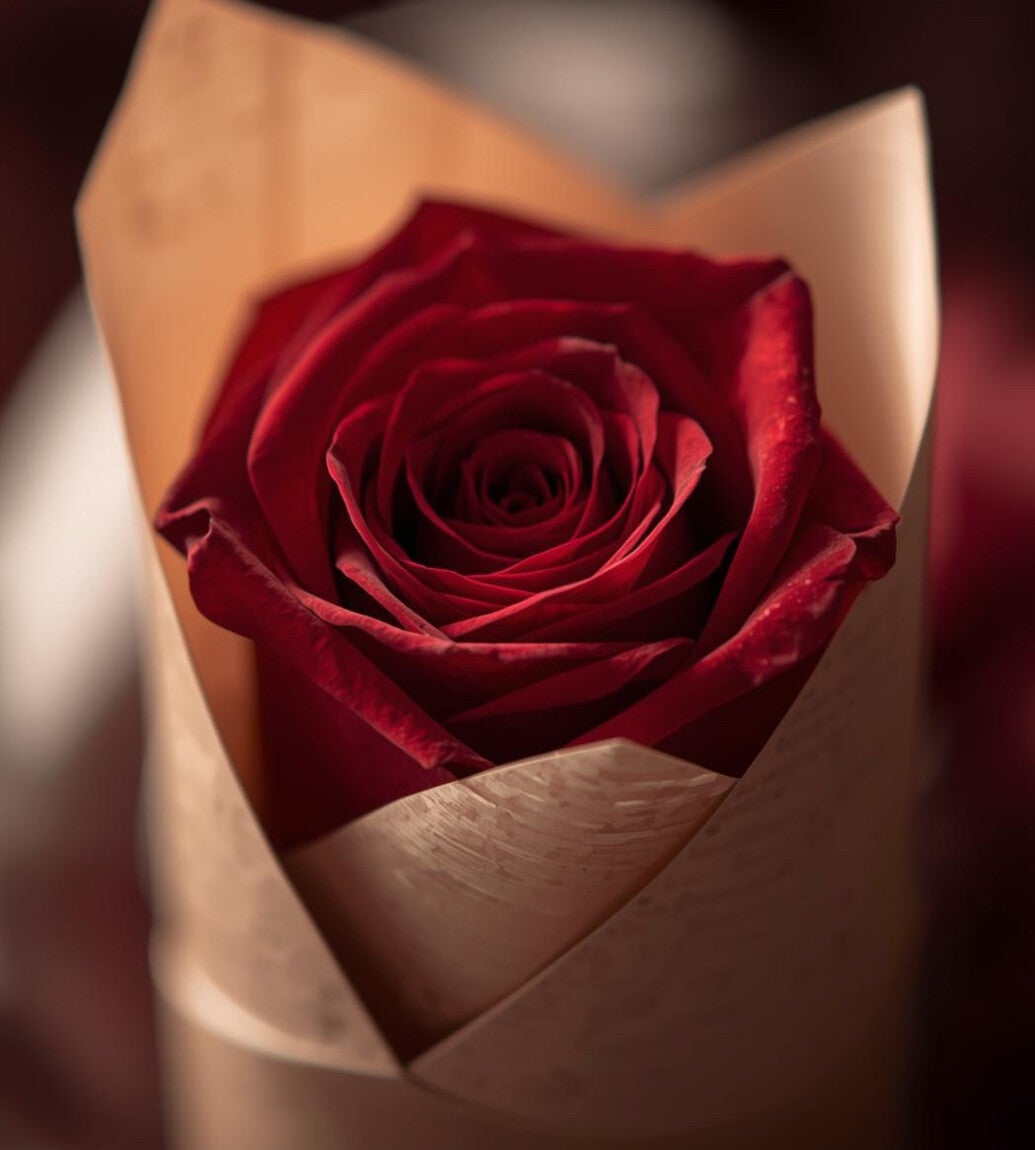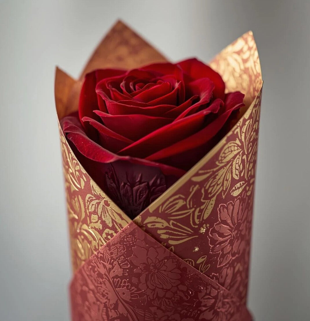 A single red rose, elegantly nestled in handpicked delightful packaging, complete with a complimentary card.